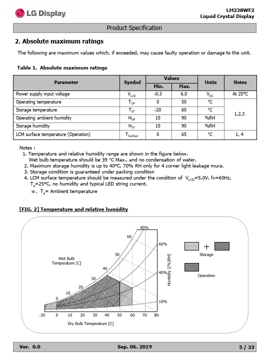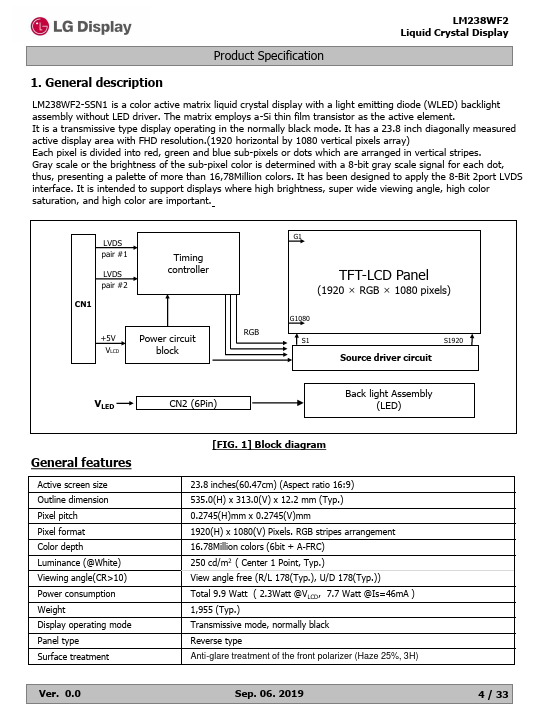LM238WF2-SSN1 is a color active matrix liquid crystal display with a light emitting diode (WLED) backlight assembly without LED driver. The matrix employs a-Si thin film transistor as the active element. It is a transmissive type display operating in the normally black mode.