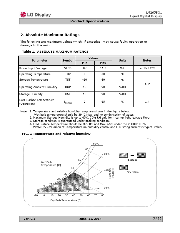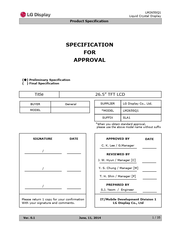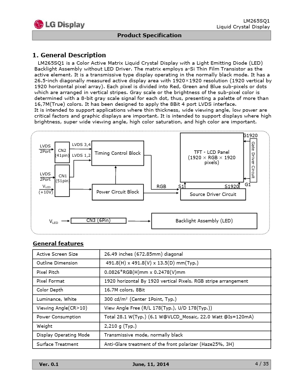 LM265SQ1 is a Color Active Matrix Liquid Crystal Display with a Light Emitting Diode (LED) Backlight Assembly without LED Driver. The matrix employs a-Si Thin Film Transistor as the active element. It is a transmissive type display operating in the normally black mode.
