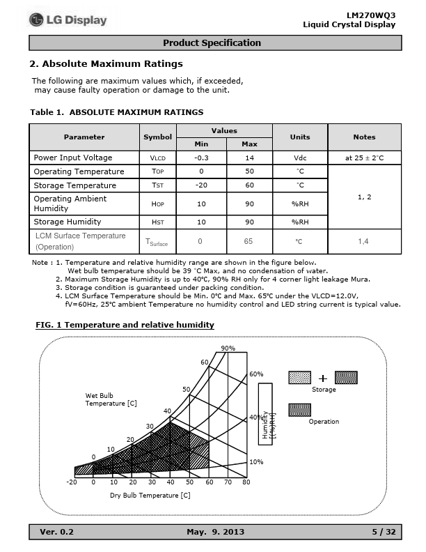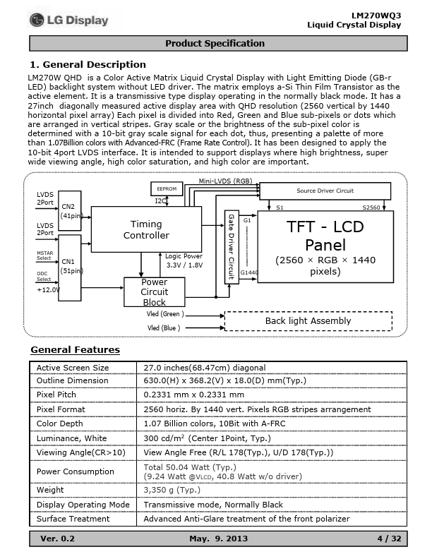 LM270W QHD is a Color Active Matrix Liquid Crystal Display with Light Emitting Diode (GB-r LED) backlight system without LED driver. The matrix employs a-Si Thin Film Transistor as the active element. It is a transmissive type display operating in the normally black mode.