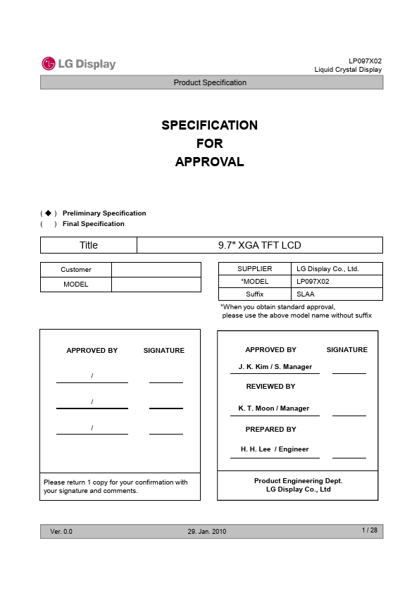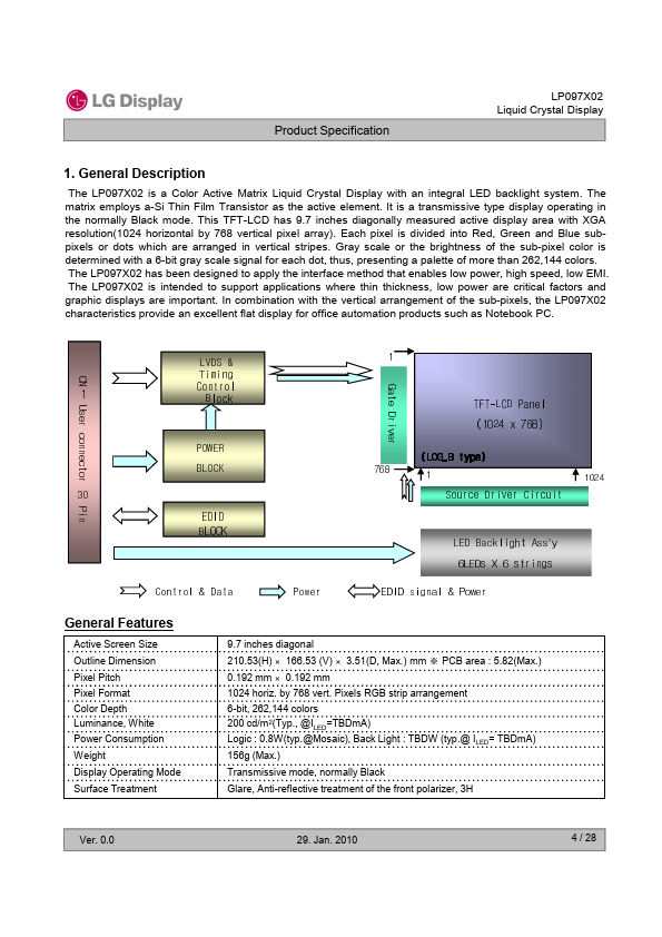 The LP097X02 is a Color Active Matrix Liquid Crystal Display with an integral LED backlight system. The matrix employs a-Si Thin Film Transistor as the active element. It is a transmissive type display operating in the normally Black mode.