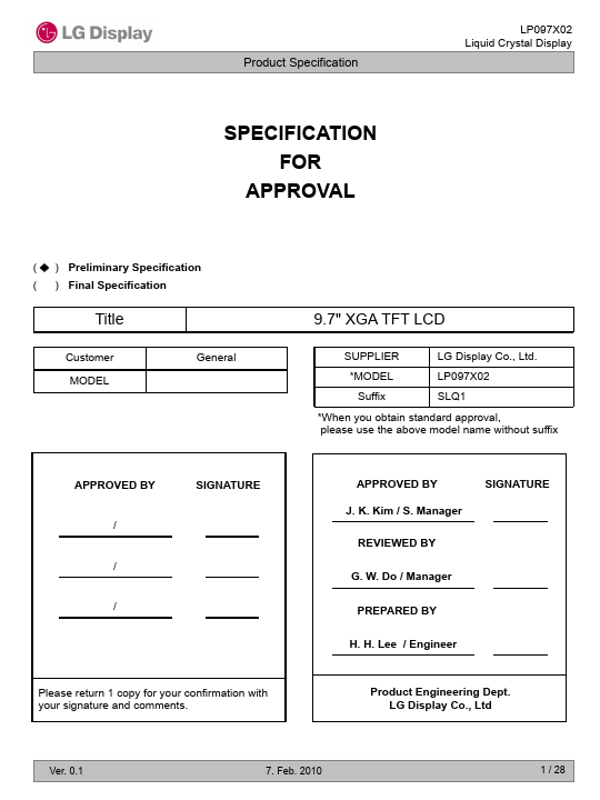 The LP097X02 is a Color Active Matrix Liquid Crystal Display with an integral LED backlight system. The matrix employs a-Si Thin Film Transistor as the active element. It is a transmissive type display operating in the normally Black mode.