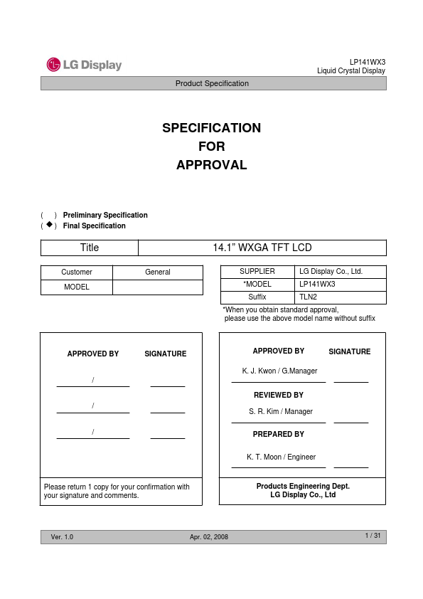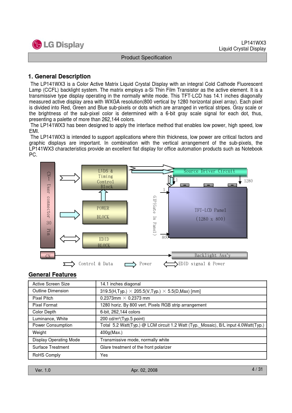 The LP141WX3 is a Color Active Matrix Liquid Crystal Display with an integral Cold Cathode Fluorescent Lamp (CCFL) backlight system. The matrix employs a-Si Thin Film Transistor as the active element. It is a transmissive type display operating in the normally white mode.