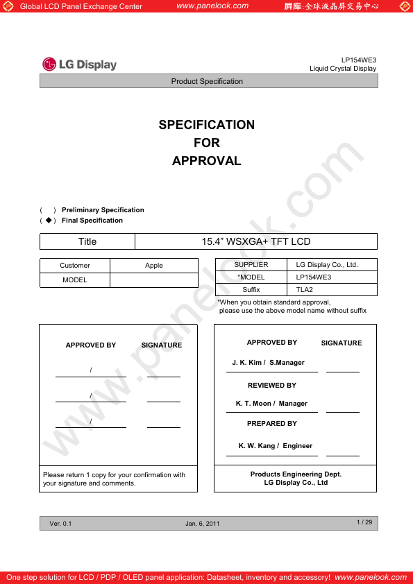 Global LCD Panel Exchange Center .panelook. $ 7)7 /&' 6833/,(5 / 'LVSOD &R /WG 02'(/ /3 :( 6XIIL[ 7/$ :KHQ RX REWDLQ VWDQGDUG DSSURYDO SOHDVH XVH WKH DERYH PRGHO QDPH ZLWKRXW VXIIL[ $33529(' %< - . .LP 6 0DQDJHU 6, 1$785( 5(9,(:(' %<.