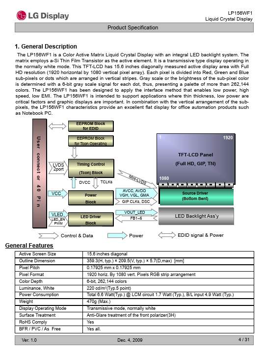 The LP156WF1 is a Color Active Matrix Liquid Crystal Display with an integral LED backlight system. The matrix employs a-Si Thin Film Transistor as the active element. It is a transmissive type display operating in the normally white mode.