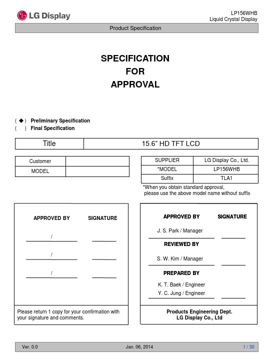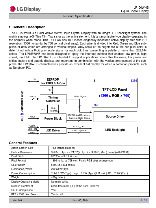 The LP156WHB is a Color Active Matrix Liquid Crystal Display with an integral LED backlight system. The matrix employs a-Si Thin Film Transistor as the active element. It is a transmissive type display operating in the normally white mode.