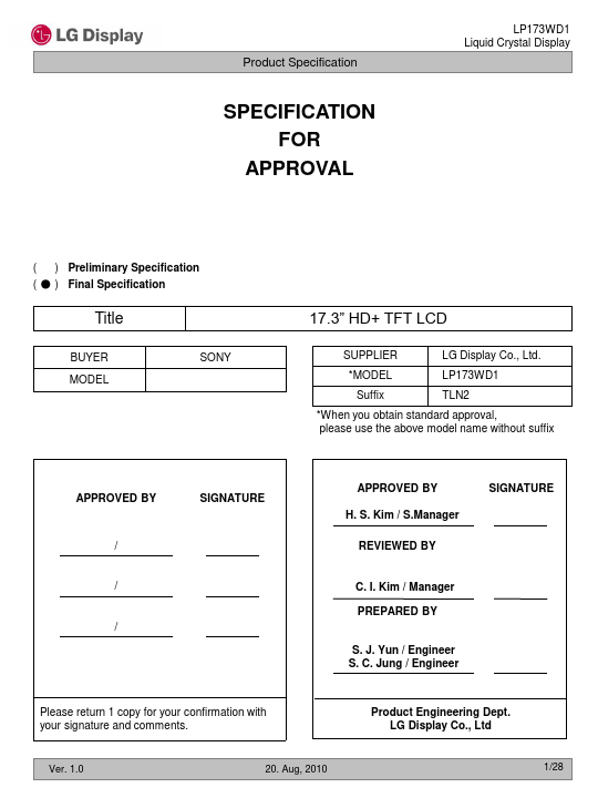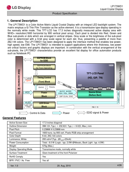 The LP173WD1 is a Color Active Matrix Liquid Crystal Display with an integral LED backlight system. The matrix employs a-Si Thin Film Transistor as the active element. It is a transmissive type display operating in the normally white mode.