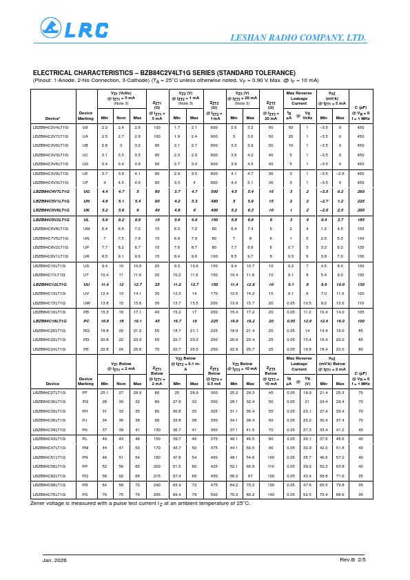 Zener Voltage Regulator Diodes LBZB84C2V4LT1G SERIES ƽ We declare that the material of product pliance with RoHS requirements. 3 1 2 MAXIMUM CASE TEMPERATURE FOR SOLDERING PURPOSES: Device mounted on an FR-4 PCB, single-sided copper, tin-plated and standard footprint.