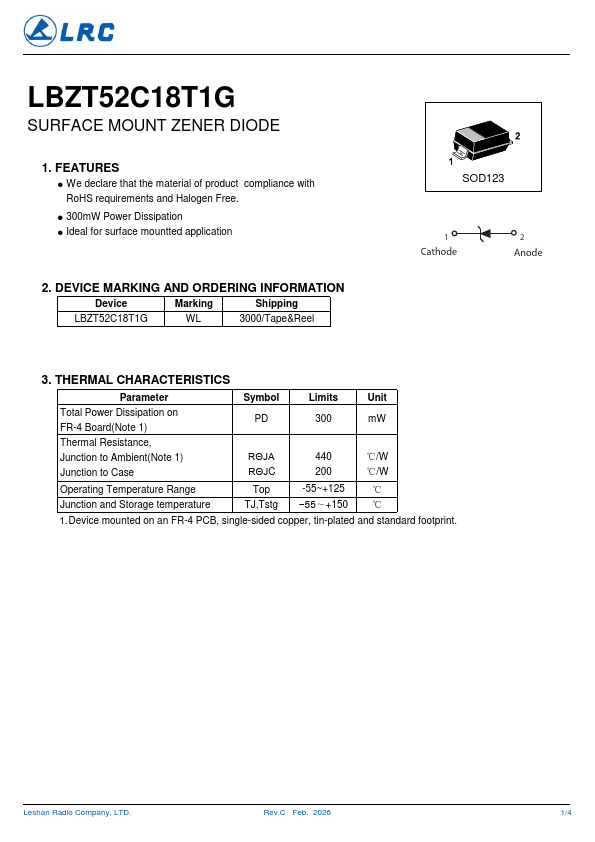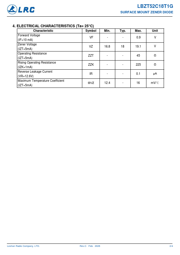 LBZT52C18T1G SURFACE MOUNT ZENER DIODE.