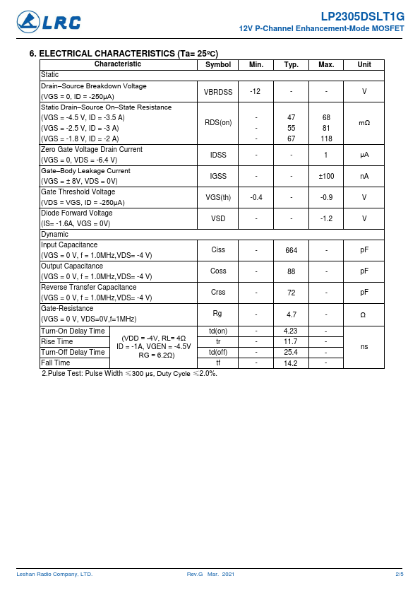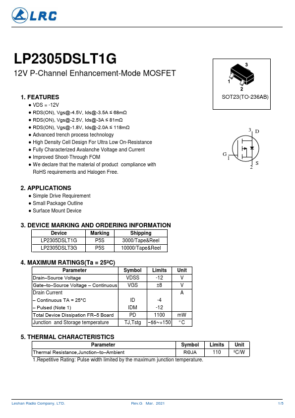 LP2305DSLT1G 12V P-Channel Enhancement-Mode MOSFET.