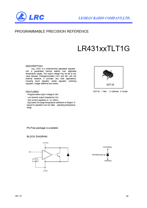 The LR431 is a three-terminal adjustable regulator with a guaranteed thermal stability over applicable temperature ranges. The output voltage may be set to any value between Vref(approximately 2.5V) and 36V with two external resistors. It provides very wide applications, including shunt regulator, series regulator, switching regulator, voltage reference and others.