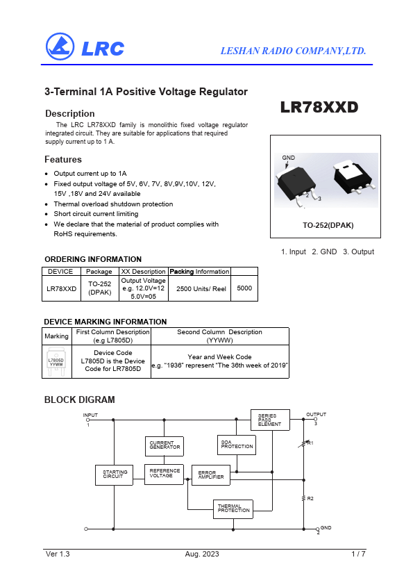 The LRC LR78XXD family is monolithic fixed voltage regulator integrated circuit. They are suitable for applications that required supply current up to 1.