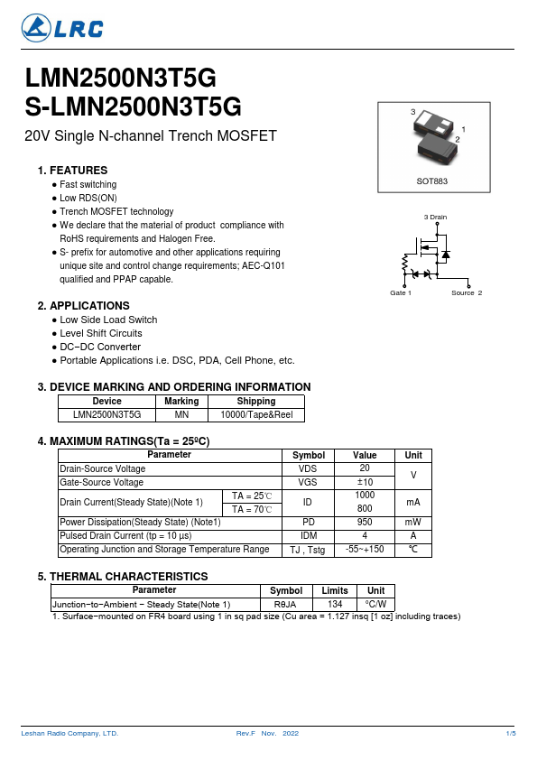 LMN2500N3T5G S-LMN2500N3T5G 20V Single N-channel Trench MOSFET.
