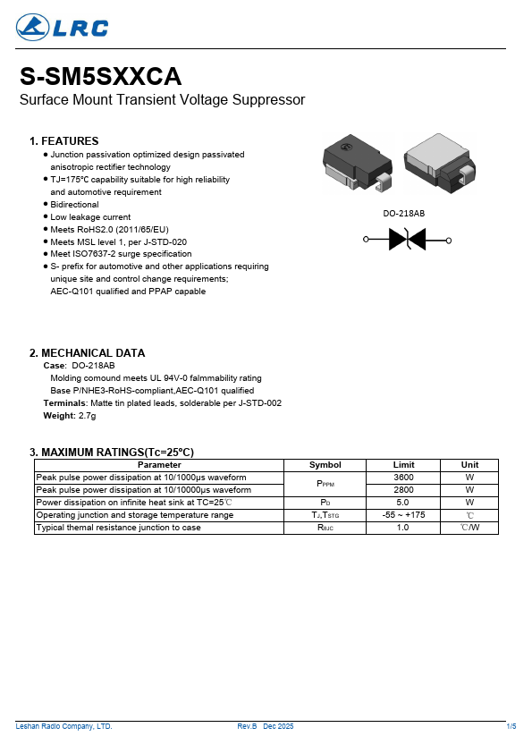 S-SM5SXXCA Surface Mount Transient Voltage Suppressor.