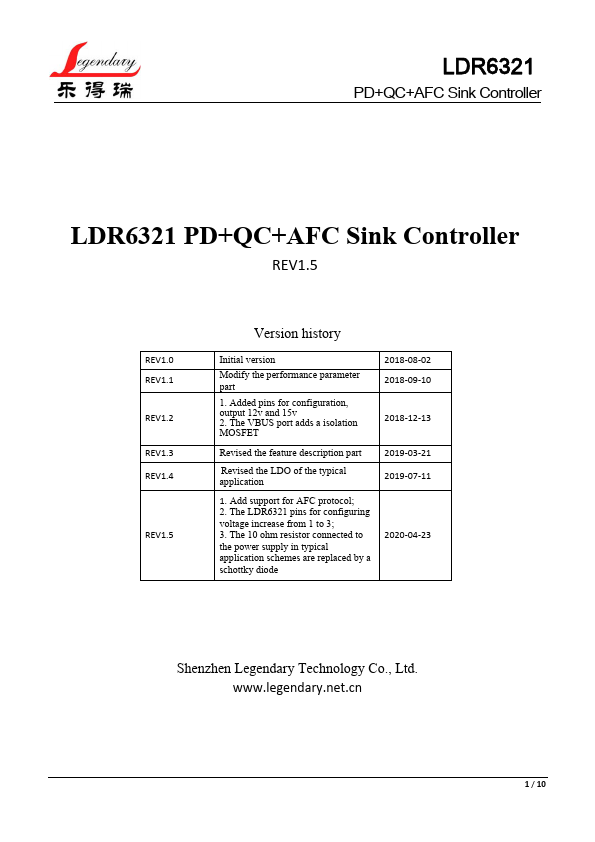 4.1 LDR6321 pins diagram LDR6321 PD+QC+AFC Sink Controller Figure1 LDR6321 pins diagram 4.2 LDR6321 pins function description Pin Number Pin Name Type 1 VSS -- 2 Vcon0 I 3 Vcon1 I 4 Vcon2 I 5 EN_D+ I/O 6 QC_EN+ O 7 DOWN_D+ I/O 8 QC_EN- O 9 ADC_D- I/O Function description Chip Ground pin Pin floating to request the maxim.