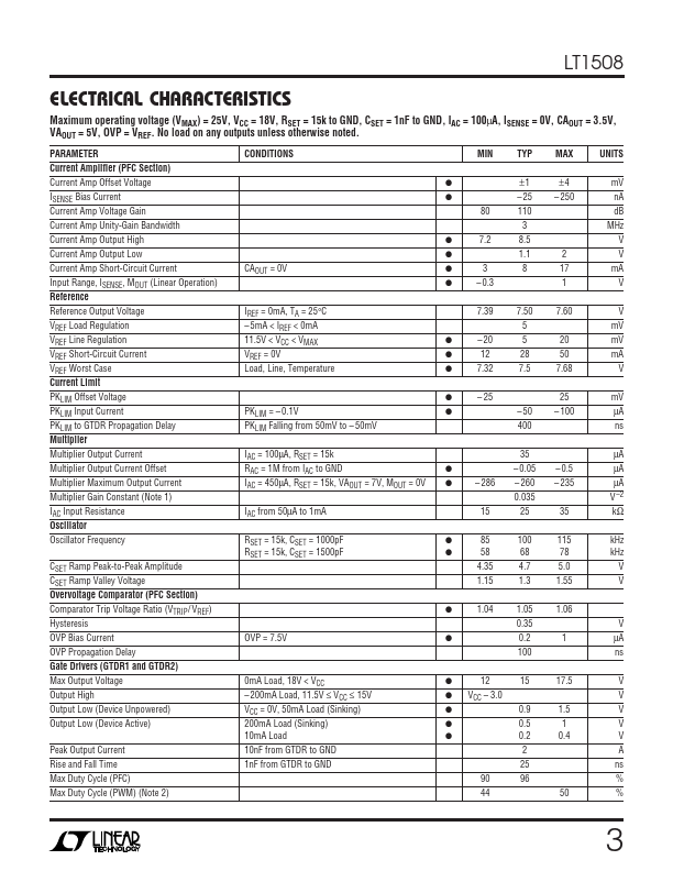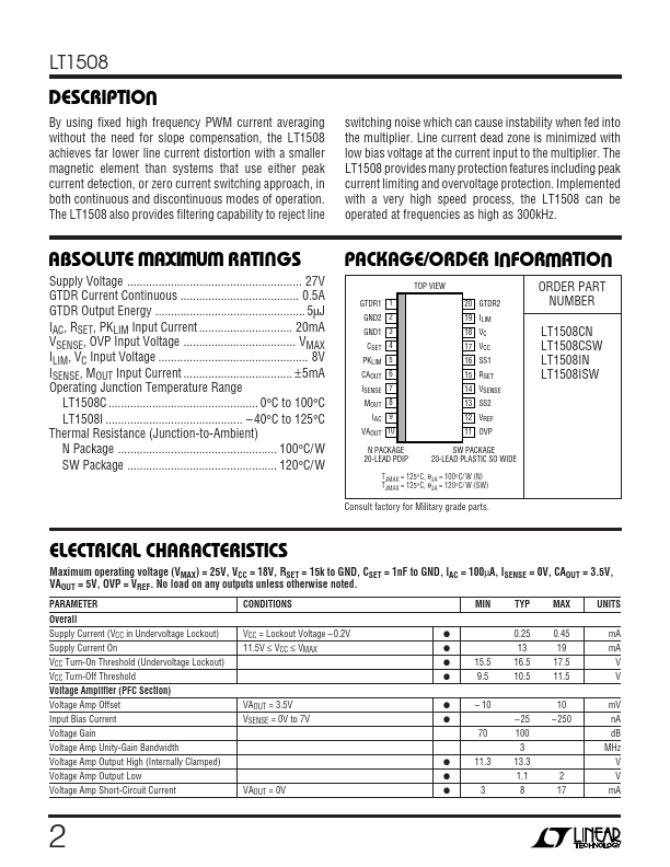 The LT ®1508 is a plete solution for universal off-line switching power supplies utilizing active power factor correction. The PFC section is identical to the LT1248 PFC controller except the EN/SYNC pin is removed because PFC and PWM are synchronized internally. The voltage mode PWM section (LT1509 is the current mode counterpart) contains all the primary side functions to convert the PFC preregulated high voltage...