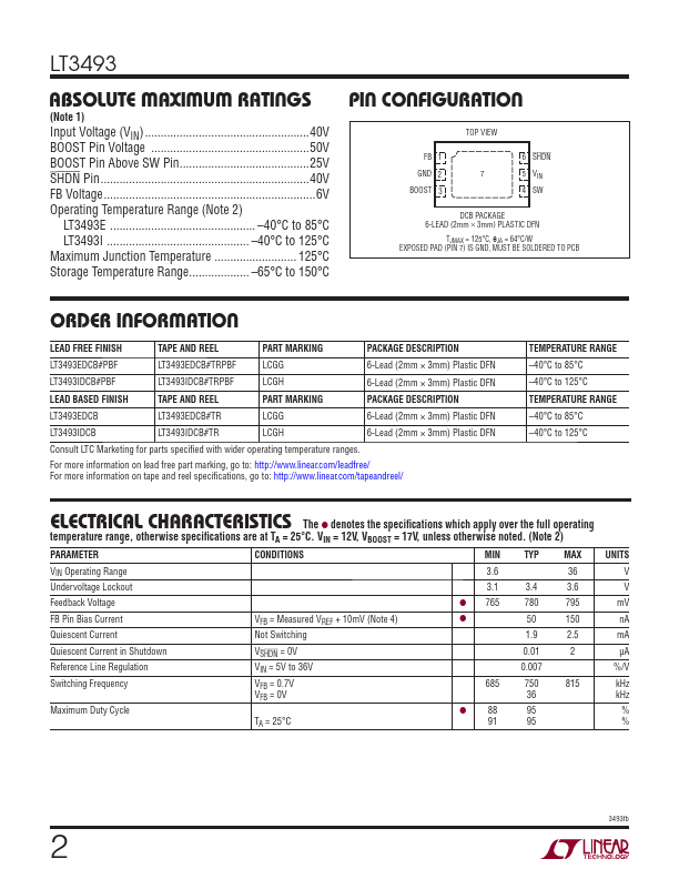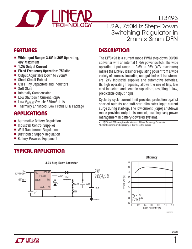 The LT®3493 is a current mode PWM step-down DC/DC converter with an internal 1.75A power switch. The wide operating input range of 3.6V to 36V (40V maximum) makes the LT3493 ideal for regulating power from a wide variety of sources, including unregulated wall transformers, 24V industrial supplies and automotive batteries. Its high operating frequency allows the use of tiny, low cost inductors and ceramic capacitors,...