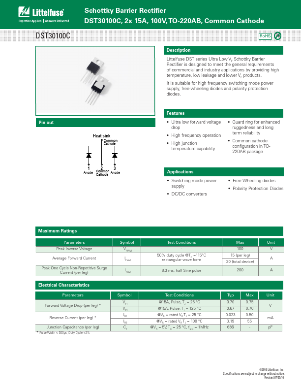 - Polarity Protection Diodes Heat sink Cathode CatMhodaexACimnoomdumeomn CRaathtoidnegs 1 2 3 Parameters Cathode SymbolAnode Pinout 4 Peak Inverse Voltage ITO-220AB Common AnAovdeerage Forward Current 1 VRWM2 TPOi-n2o2u0tA5ICF(AV) Peak One Cycle Non-Repetitive Surge Current (per leg) IFSM Test Conditions - 50% duty cycle @TC =115°C rectangular wave form