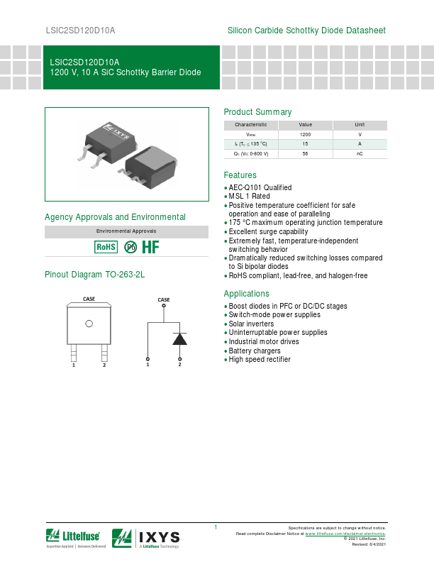 LSIC2SD120D10A is 10A SiC Schottky Barrier Diode manufactured by Littelfuse.