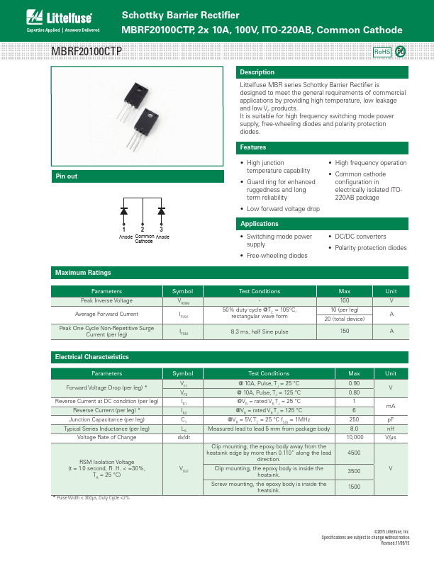 MBRF20100CTP is Schottky Barrier Rectifier manufactured by Littelfuse.