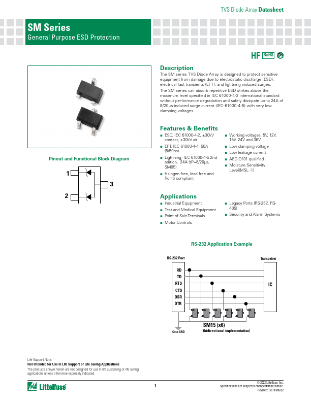 The SM series TVS Diode Array is designed to protect sensitive equipment from damage due to electrostatic discharge (ESD), electrical fast transients (EFT), and lightning induced surges. The SM series can absorb repetitive ESD strikes above the maximum level specified in IEC 61000-4-2 international standard without performance degradation and safely dissipate up to 24A of 8/20µs induced surge current (IEC-61000-4-5)...