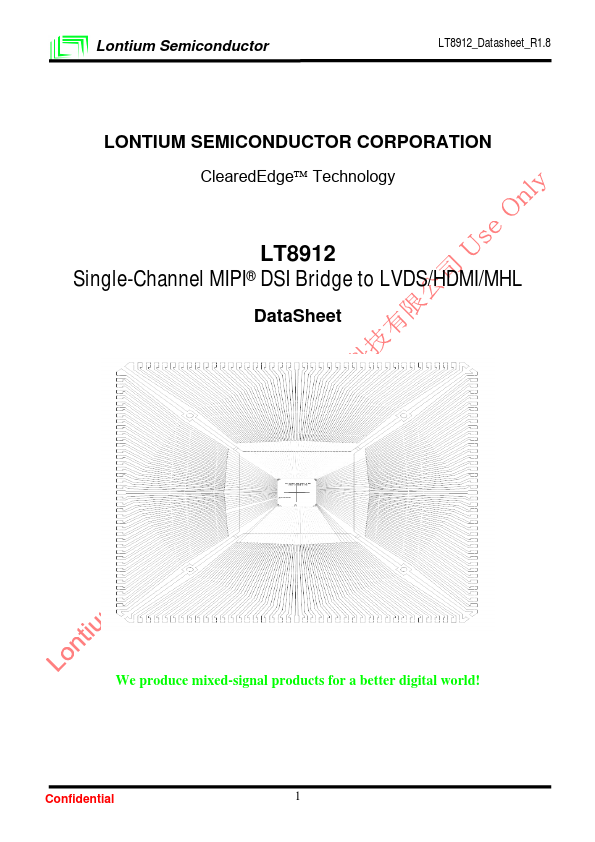 The Lontium LT8912 MIPI® DSI to LVDS and HDMI/MHL bridge features a single-channel MIPI® D-PHY receiver front-end configuration with 4 data lanes per channel operating at 1.5Gbps per data lane and a maximum input bandwidth of 6Gbps. For screen application, the bridge decodes MIPI® DSI 18bpp RGB666 and 24bpp RGB888 packets and converts the formatted video data stream to a compatible LVDS output operating at pixel clock operating from 25MHz to 154MHz, offering a single-link LVDS with 4 data lanes per link.