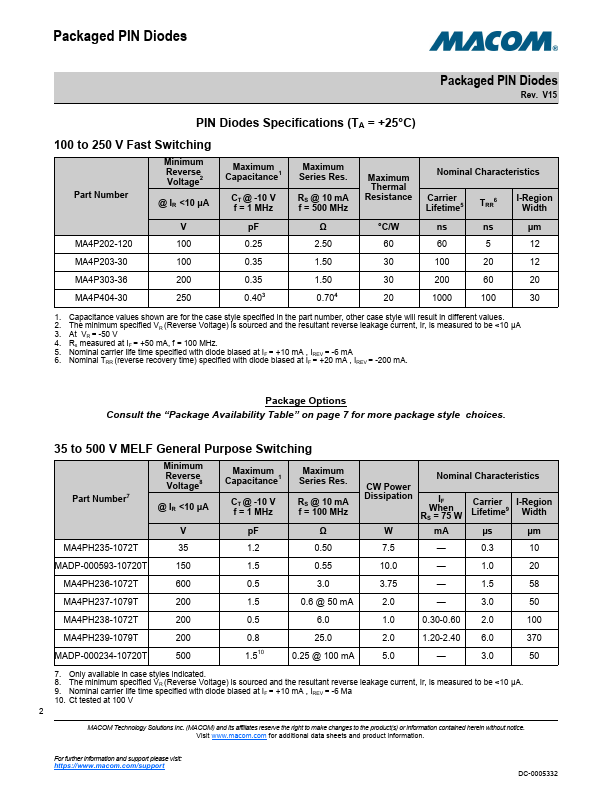and Applications MA’s broad line of packaged PIN diodes enpass a prehensive range of and package outlines. This diverse union of semiconductor technology and chip packaging gives considerable flexibility to the circuit designer. The fast switching series of packaged PIN diodes utilize a thin I-region, silicon oxide or glass passivated chip which provides for low leakage current and low insertion loss.