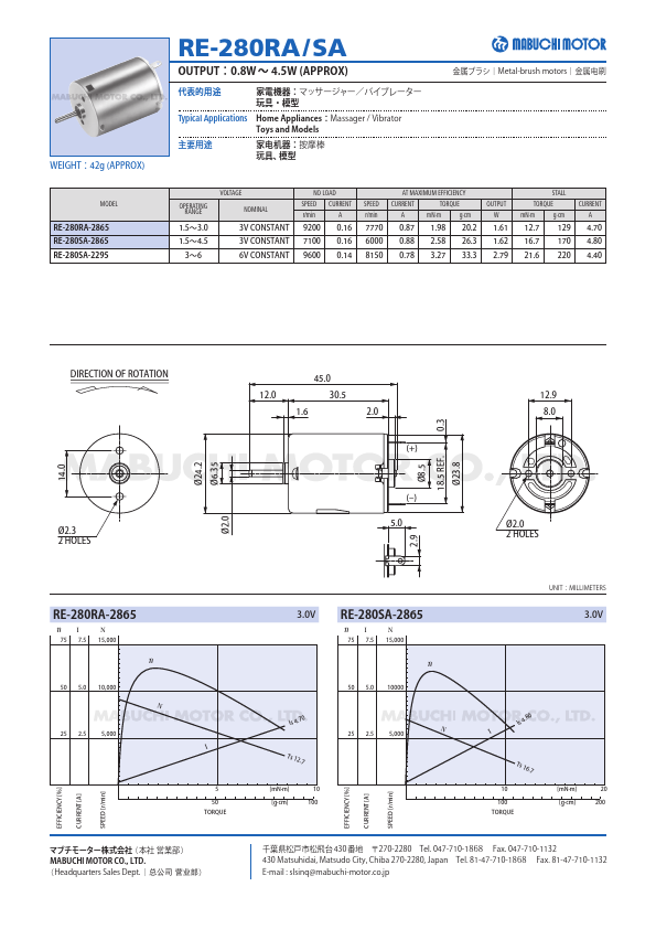 (Headquarters Sales Dept. 047-710-1132 430 Matsuhidai, Matsudo City, Chiba 270-2280, Japan Tel. slsinq@mabuchi-motor.co.jp.