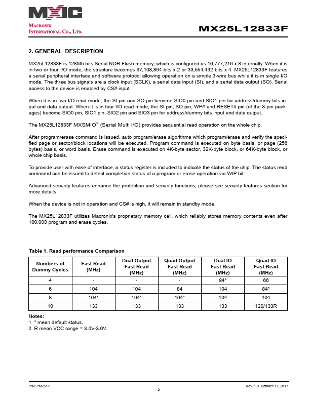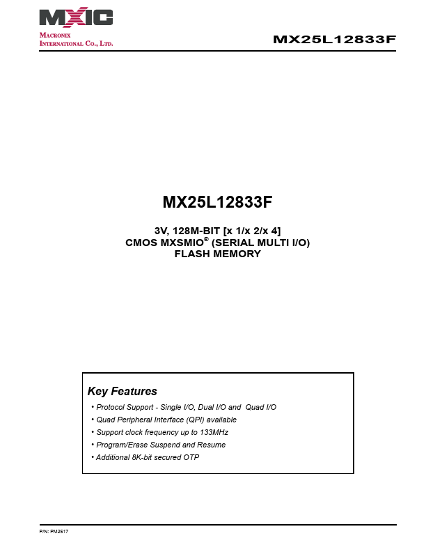 MX25L12833F is 128Mb bits Serial NOR Flash memory, which is configured as 16,777,216 x 8 internally. When it is in two or four I/O mode, the structure bees 67,108,864 bits x 2 or 33,554,432 bits x.