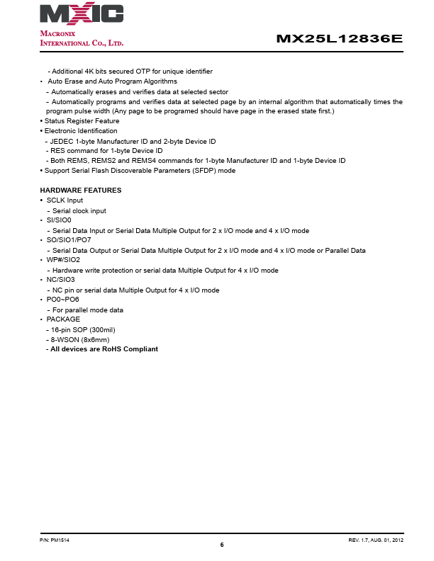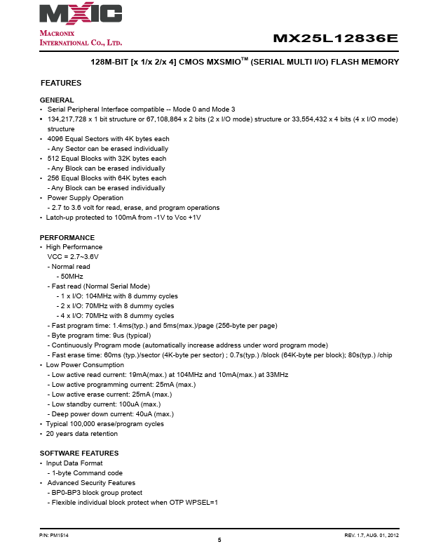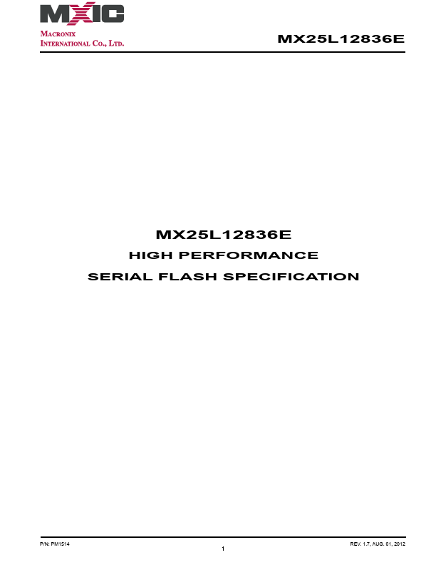 MX25L12836E MX25L12836E HIGH PERFORMANCE SERIAL FLASH SPECIFICATION P/N: 01, 2012 1 MX25L12836E 128M-BIT [x 1/x 2/x 4] CMOS MXSMIOTM (SERIAL MULTI I/O) FLASH MEMORY.