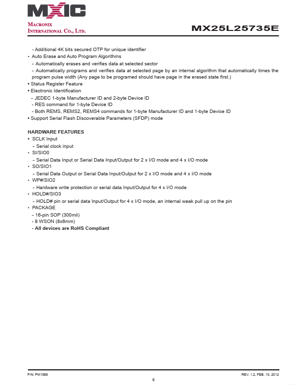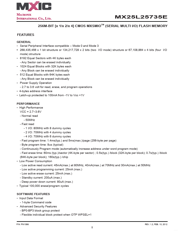 MX25L25735E MX25L25735E HIGH PERFORMANCE SERIAL FLASH SPECIFICATION P/N: MX25L25735E 256M-BIT [x 1/x 2/x 4] CMOS MXSMIOTM (SERIAL MULTI I/O) FLASH MEMORY.
