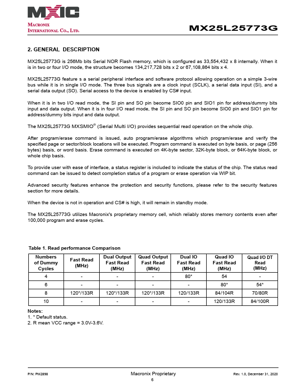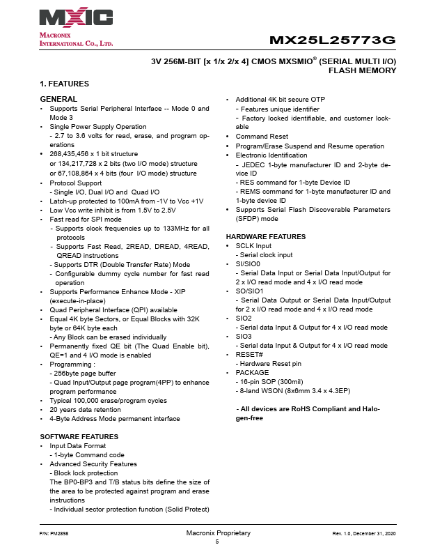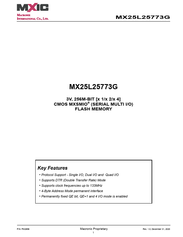 MX25L25773G MX25L25773G 3V, 256M-BIT [x 1/x 2/x 4] CMOS MXSMIO® (SERIAL MULTI I/O) FLASH.