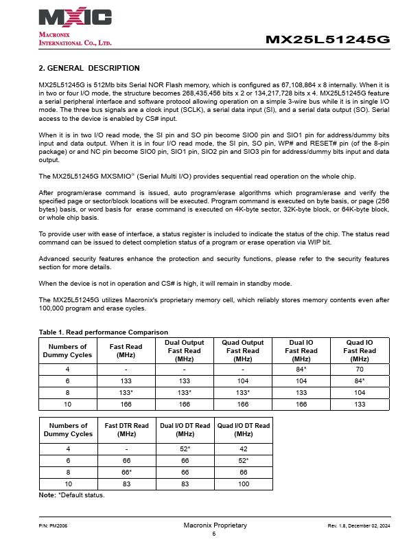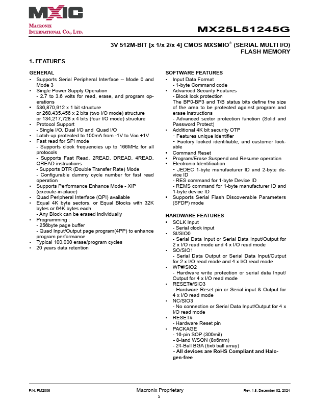 MX25L51245G MX25L51245G 3V, 512M-BIT [x 1/x 2/x 4] CMOS MXSMIO® (SERIAL MULTI I/O) FLASH.