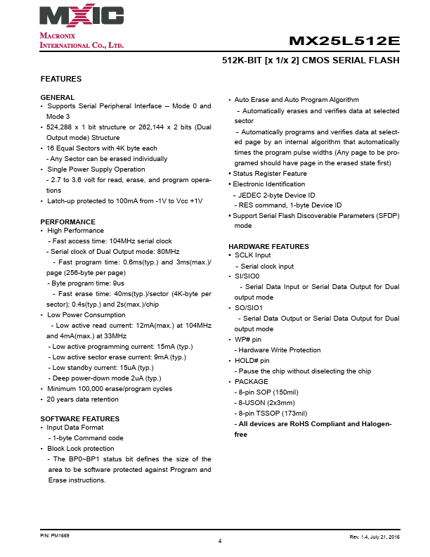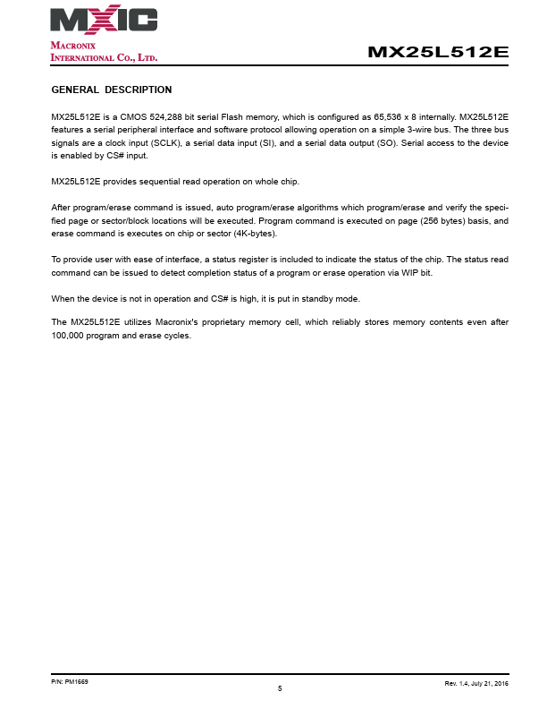 MX25L512E is a CMOS 524,288 bit serial Flash memory, which is configured as 65,536 x 8 internally.