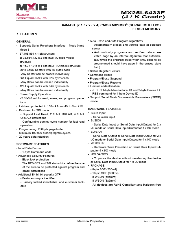 MX25L6433F (J / K Grade) MX25L6433F- J/K Grade 3V, 64M-BIT [x 1/x 2/x 4] CMOS MXSMIO® (SERIAL MULTI I/O) FLASH MEMORY.