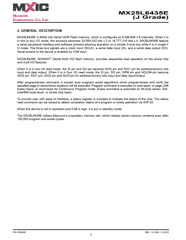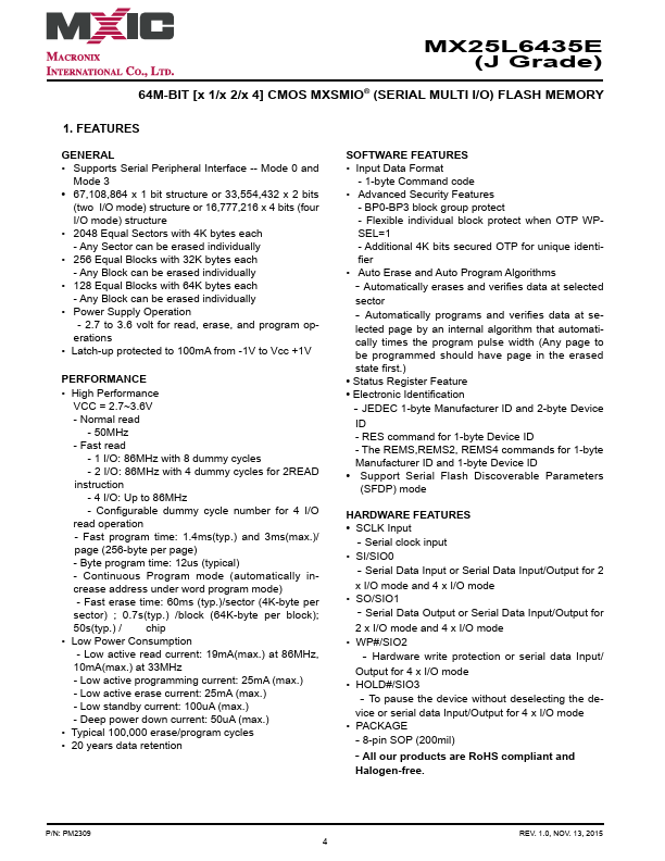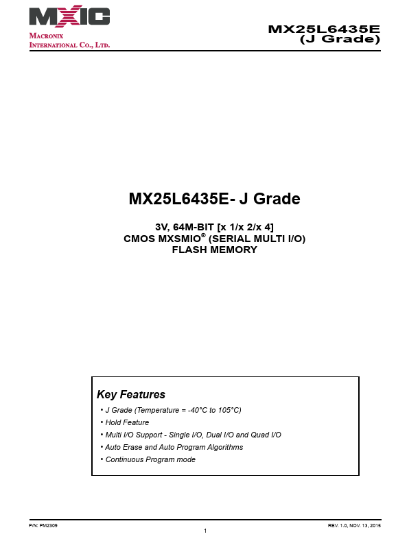 MX25L6435E (J Grade) MX25L6435E- J Grade 3V, 64M-BIT [x 1/x 2/x 4] CMOS MXSMIO® (SERIAL MULTI I/O) FLASH MEMORY.