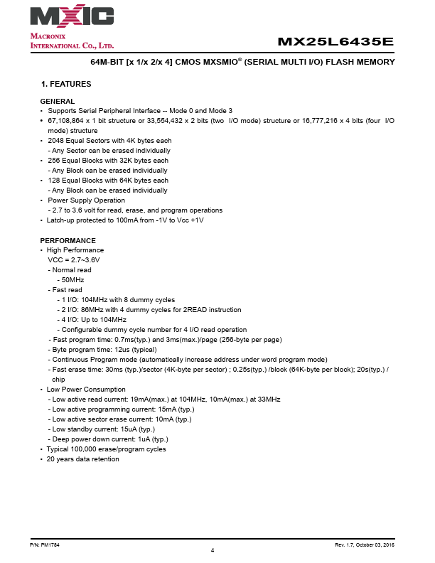 MX25L6435E MX25L6435E 3V, 64M-BIT [x 1/x 2/x 4] CMOS MXSMIO® (SERIAL MULTI I/O) FLASH.