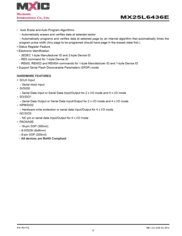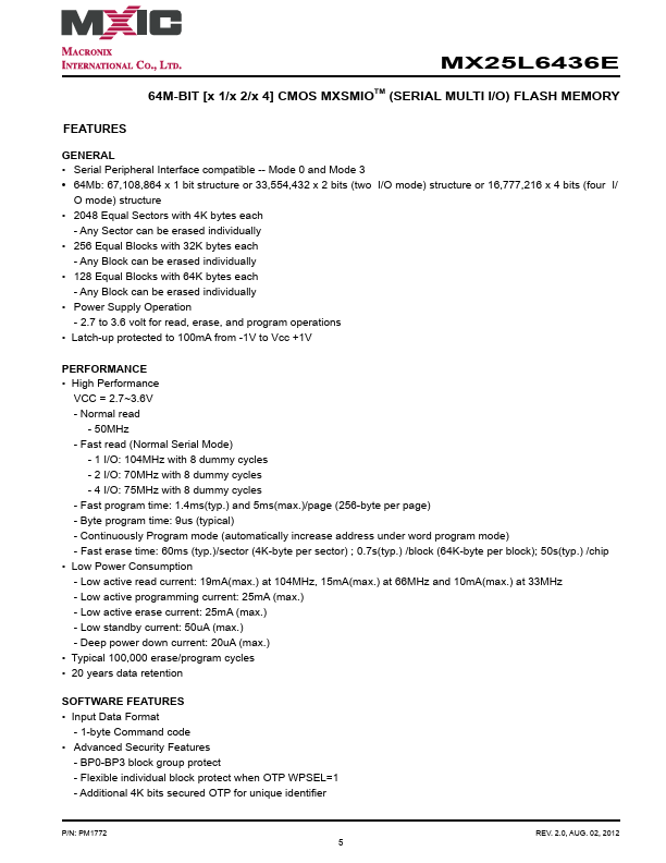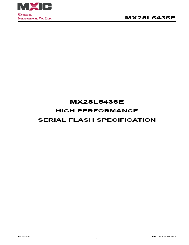 MX25L6436E MX25L6436E HIGH PERFORMANCE SERIAL FLASH SPECIFICATION P/N: 02, 2012 1 MX25L6436E 64M-BIT [x 1/x 2/x 4] CMOS MXSMIOTM (SERIAL MULTI I/O) FLASH MEMORY.