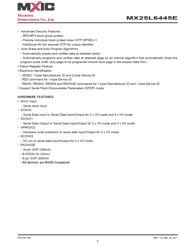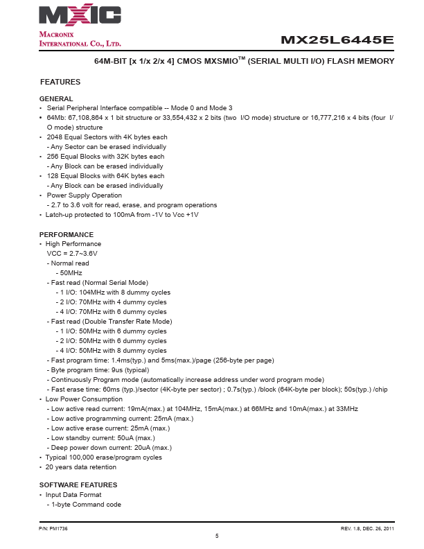 MX25L6445E MX25L6445E HIGH PERFORMANCE SERIAL FLASH SPECIFICATION P/N: 26, 2011 1 MX25L6445E 64M-BIT [x 1/x 2/x 4] CMOS MXSMIOTM (SERIAL MULTI I/O) FLASH MEMORY.