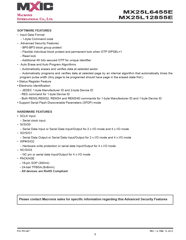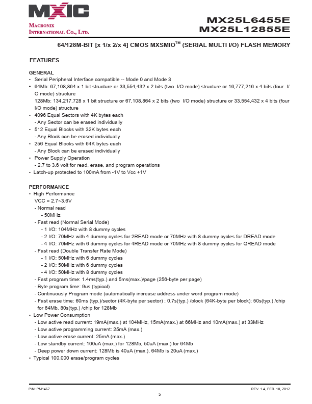 MX25L6455E MX25L12855E MX25L6455E/MX25L12855E HIGH PERFORMANCE SERIAL FLASH SPECIFICATION P/N:.