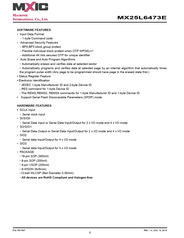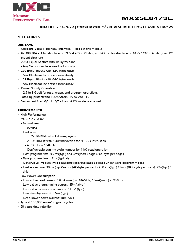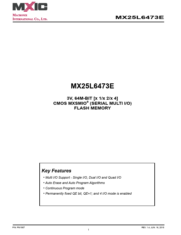 MX25L6473E MX25L6473E 3V, 64M-BIT [x 1/x 2/x 4] CMOS MXSMIO® (SERIAL MULTI I/O) FLASH.