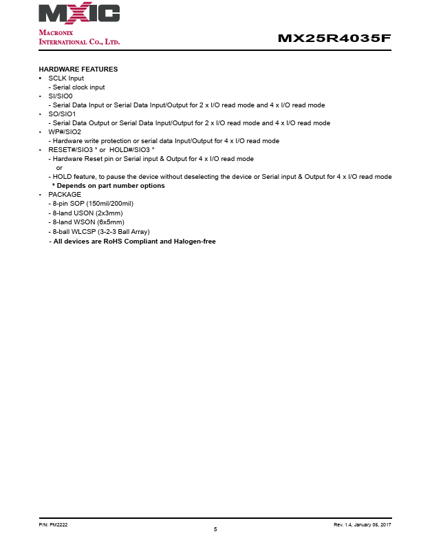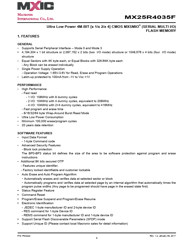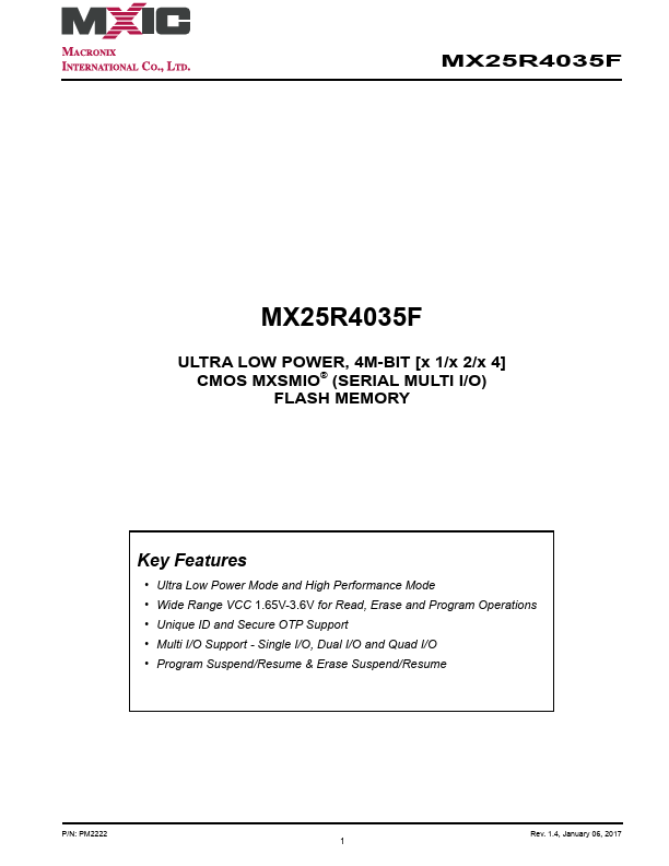 MX25R4035F MX25R4035F ULTRA LOW POWER, 4M-BIT [x 1/x 2/x 4] CMOS MXSMIO® (SERIAL MULTI I/O) FLASH MEMORY.