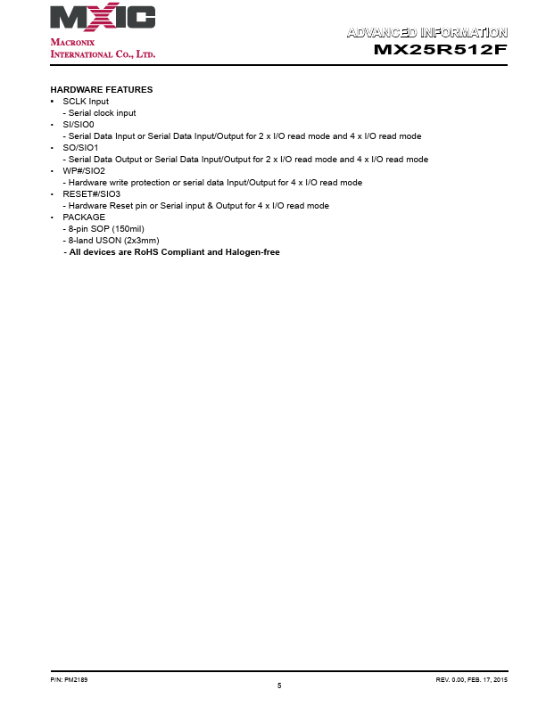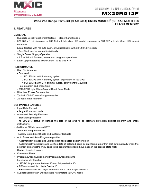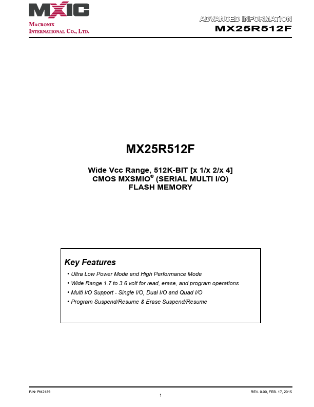 ADVANCED INFORMATION MX25R512F MX25R512F Wide Vcc Range, 512K-BIT [x 1/x 2/x 4] CMOS MXSMIO® (SERIAL MULTI I/O) FLASH MEMORY.