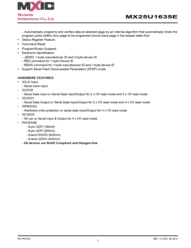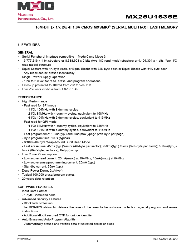 MX25U1635E MX25U1635E DATASHEET P/N: MX25U1635E 16M-BIT [x 1/x 2/x 4] 1.8V CMOS MXSMIO® (SERIAL MULTI I/O) FLASH MEMORY.