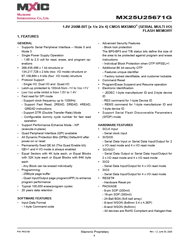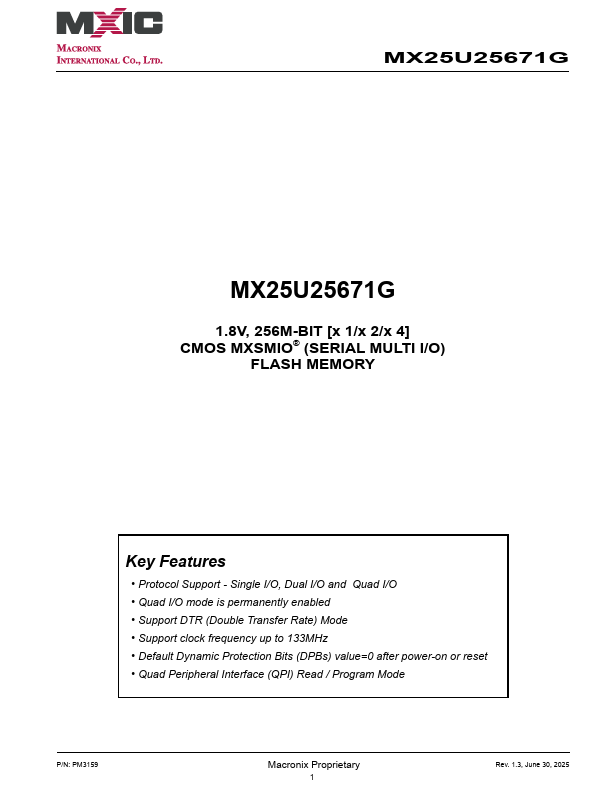 MX25U25671G MX25U25671G 1.8V, 256M-BIT [x 1/x 2/x 4] CMOS MXSMIO® (SERIAL MULTI I/O) FLASH.