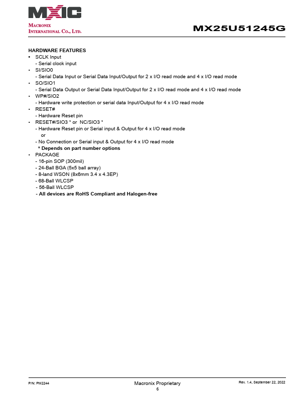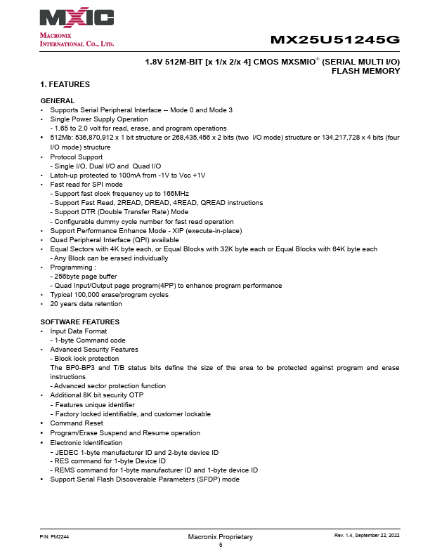 MX25U51245G MX25U51245G 1.8V, 512M-BIT [x 1/x 2/x 4] CMOS MXSMIO® (SERIAL MULTI I/O) FLASH.