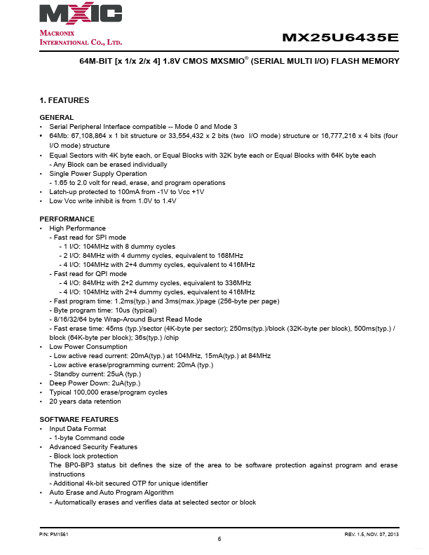 MX25U6435E MX25U6435E DATASHEET P/N: MX25U6435E 64M-BIT [x 1/x 2/x 4] 1.8V CMOS MXSMIO® (SERIAL MULTI I/O) FLASH MEMORY.