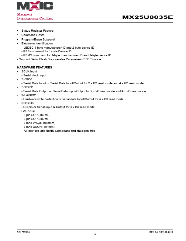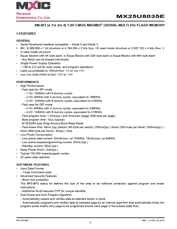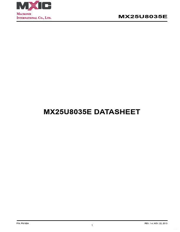 MX25U8035E MX25U8035E DATASHEET P/N: MX25U8035E 8M-BIT [x 1/x 2/x 4] 1.8V CMOS MXSMIO® (SERIAL MULTI I/O) FLASH MEMORY.