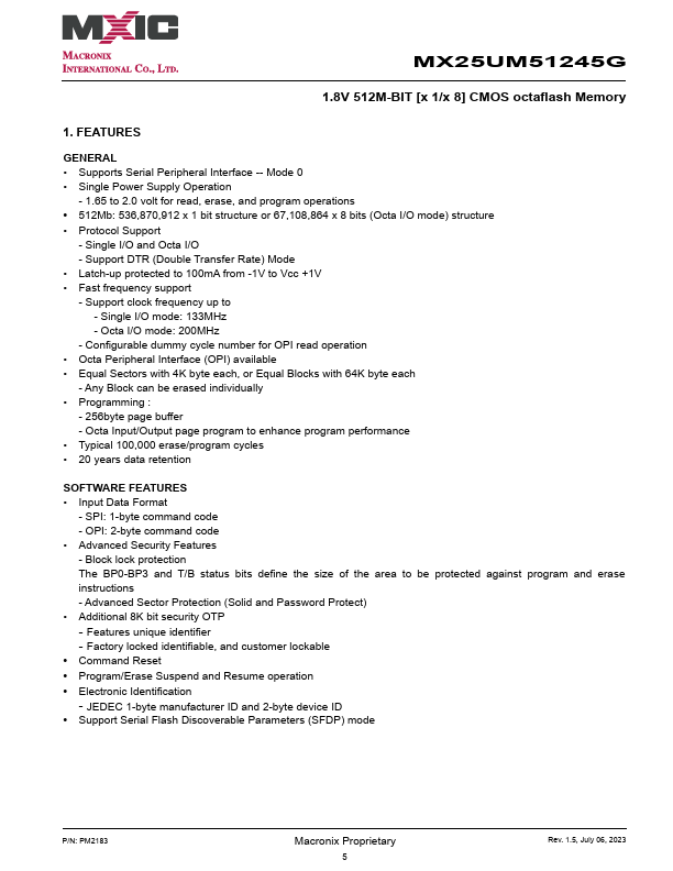 MX25UM51245G is 512Mb bits Octal interface Serial NOR Flash memory, which is configured as 67,108,864 x 8 internally.