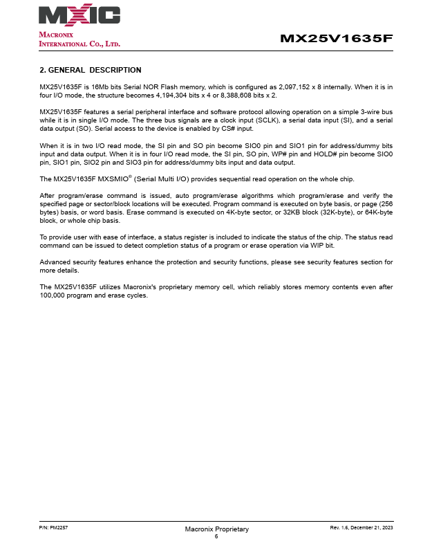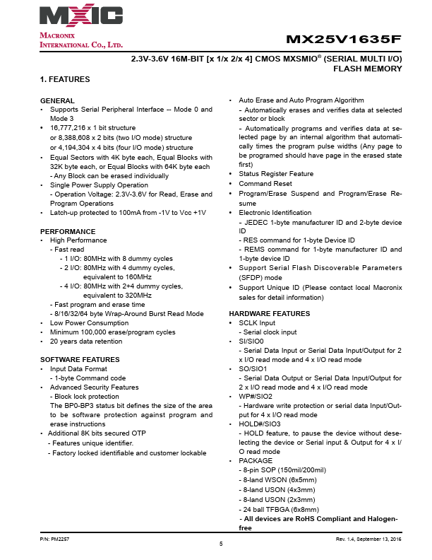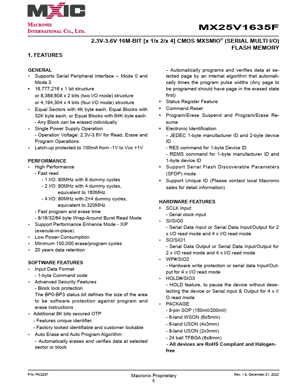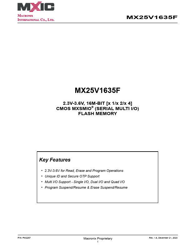 MX25V1635F MX25V1635F 2.3V-3.6V, 16M-BIT [x 1/x 2/x 4] CMOS MXSMIO® (SERIAL MULTI I/O) FLASH.