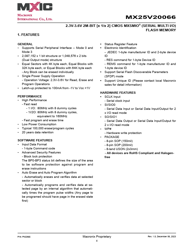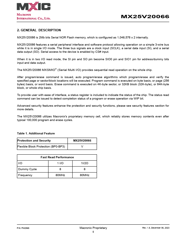 MX25V20066 is 2Mb bits Serial NOR Flash memory, which is configured as 1,048,576 x 2 internally.